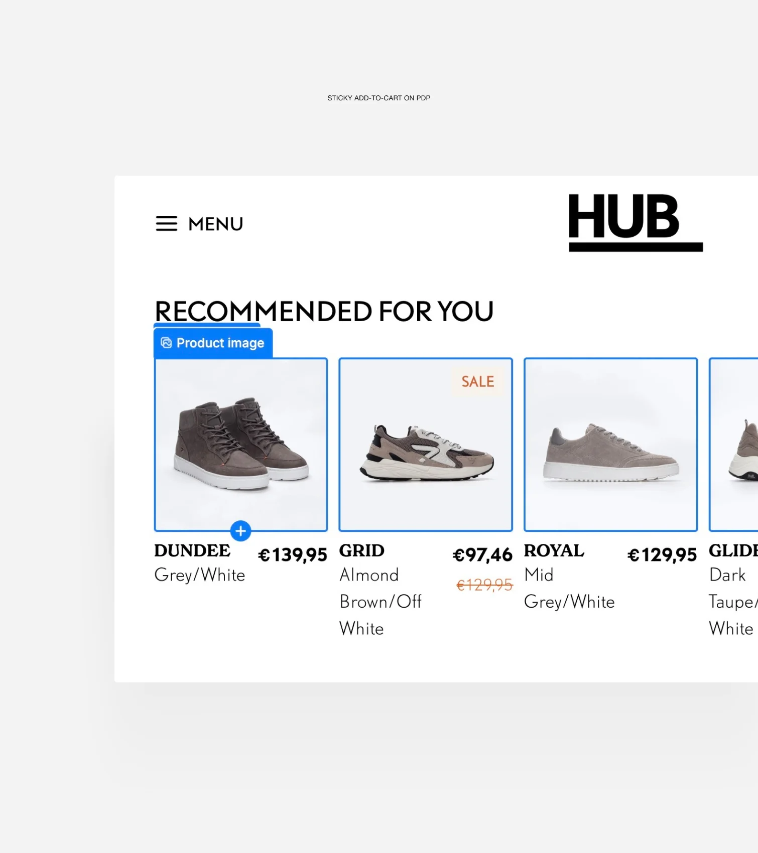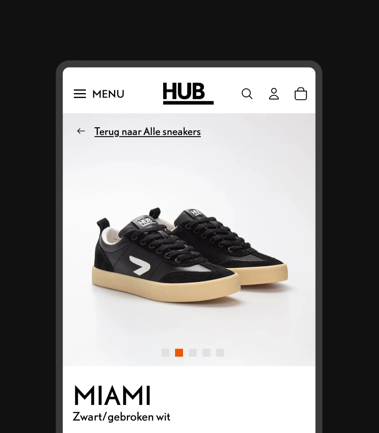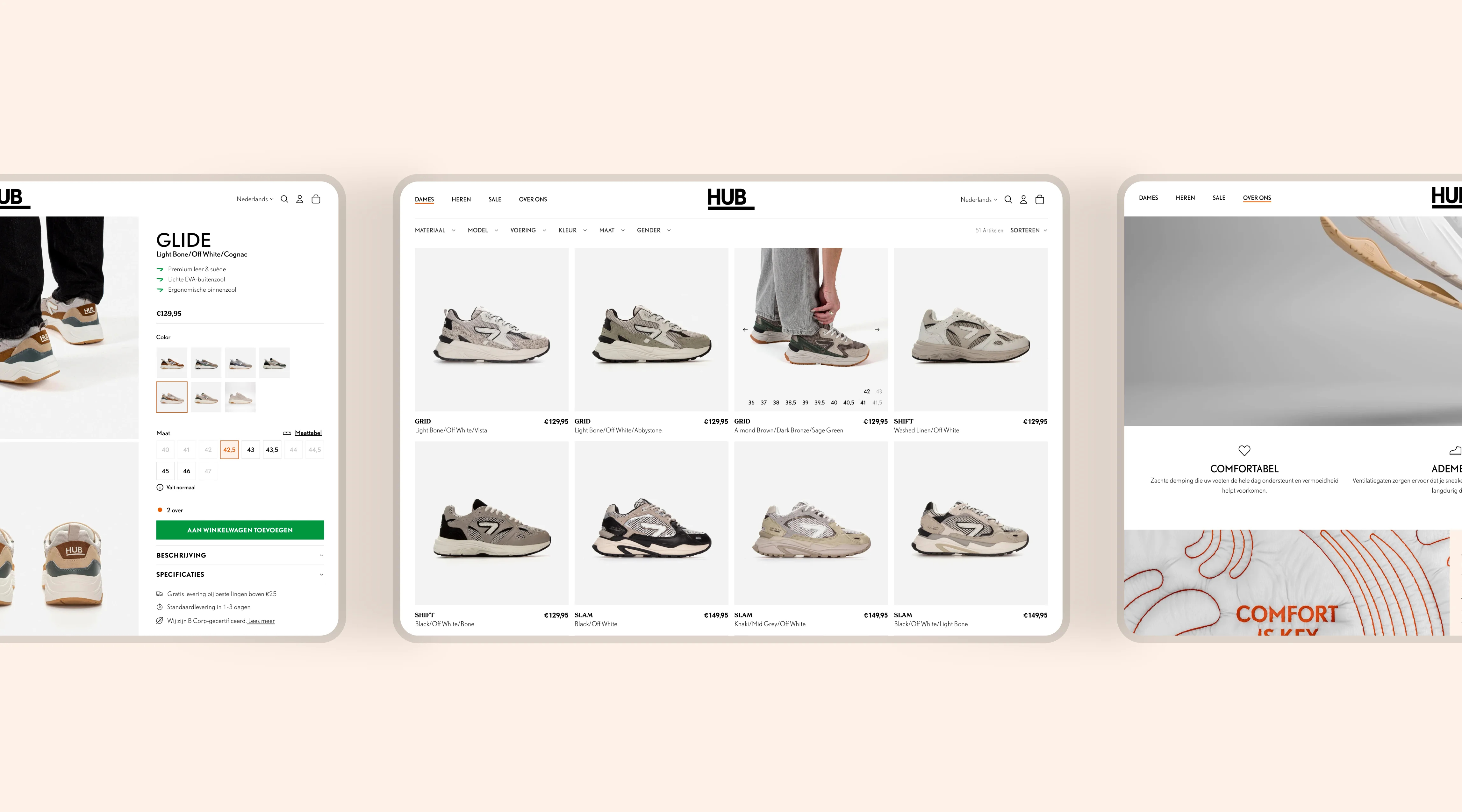 Geen baanbrekende UX-aanpassingen, maar aanpassingen die resoneren met bezoekers en logisch aanvoelen. Zo kreeg de navigatie een duidelijke upgrade voor meer rust en focus, zodat het bezoekers helpt sneller hun weg te vinden. Op categoriepagina’s voegen slimme interacties extra richting toe: quickfilters en on-hover schoenmaten leiden bezoekers naar hun ideale paar. Door de sticky add-to-cart op de productdetailpagina is de stap naar de checkout altijd zichtbaar en daar kunnen bezoekers snel wisselen tussen dames- en herenvariant, om een matchend paar voor hun partner te vinden. Zo combineren we praktische gebruiksvriendelijkheid met de merkbelofte: bij HUB loop je nooit alleen.