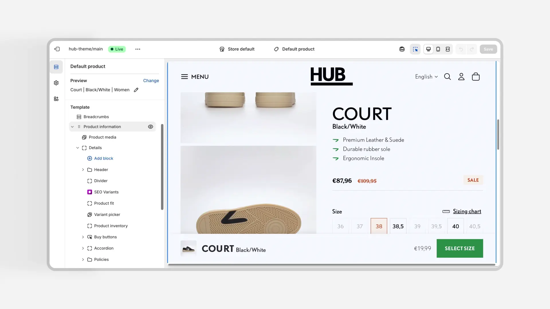 We bouwden een eigen thema, gebaseerd op het Shopify Horizon thema, zodat HUB direct profiteert van de nieuwste ontwikkelingen binnen het platform. Dat gaf ruimte voor slimme innovaties, zoals AI-gedreven homepage-elementen die door het HUB-team zelf worden beheerd. Omdat te veel vrijheid ten koste kan gaan van merkconsistentie en performance, ontwierpen we vaste bouwstenen en presets. Zo houden we de speelruimte groot voor HUB, maar wel binnen de lijnen van het veld.