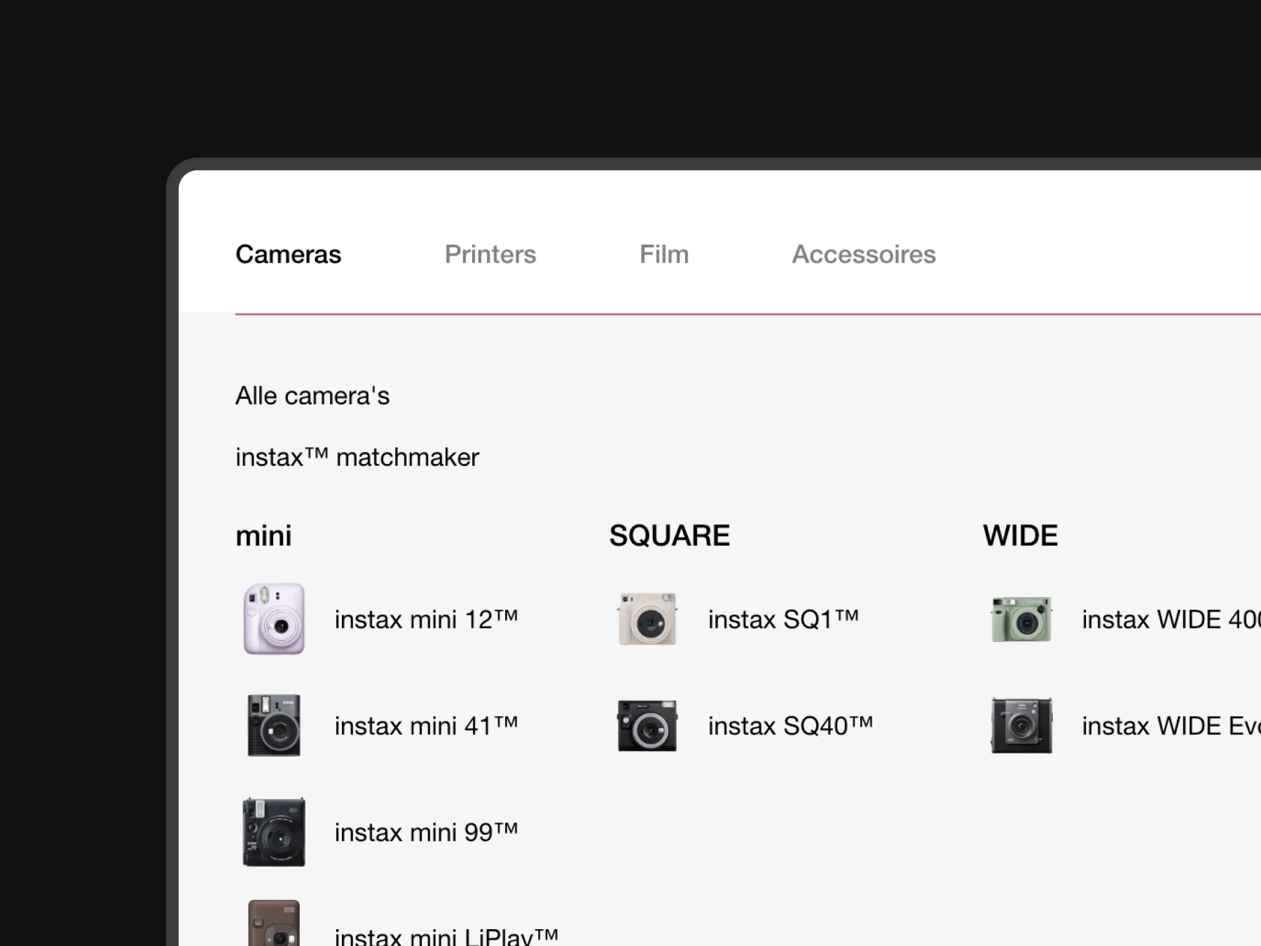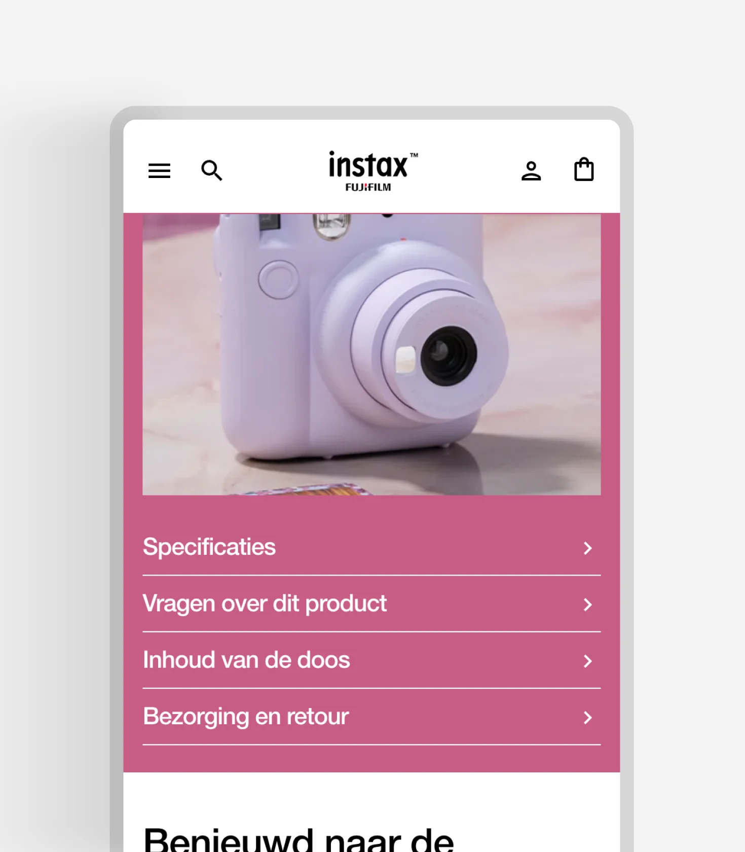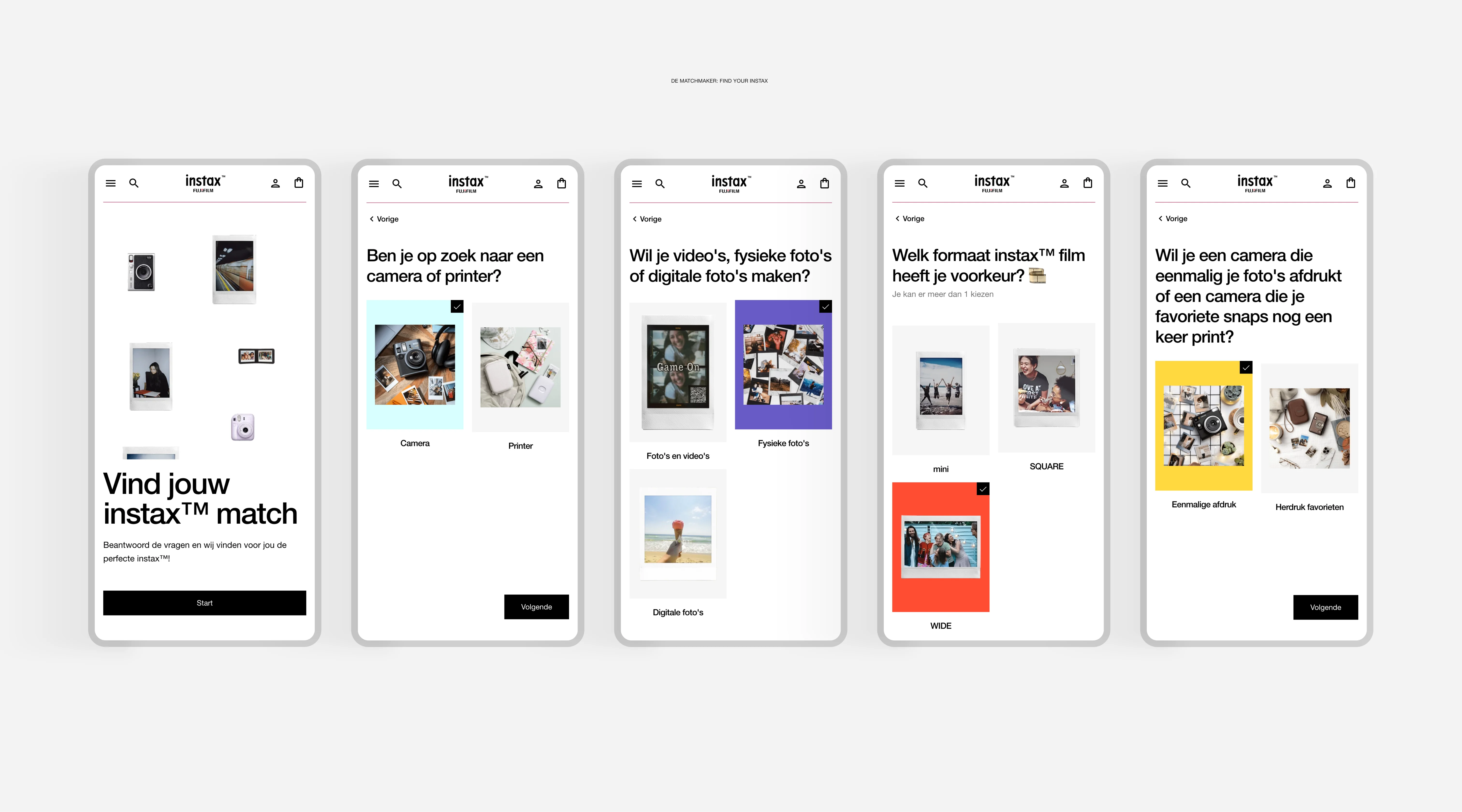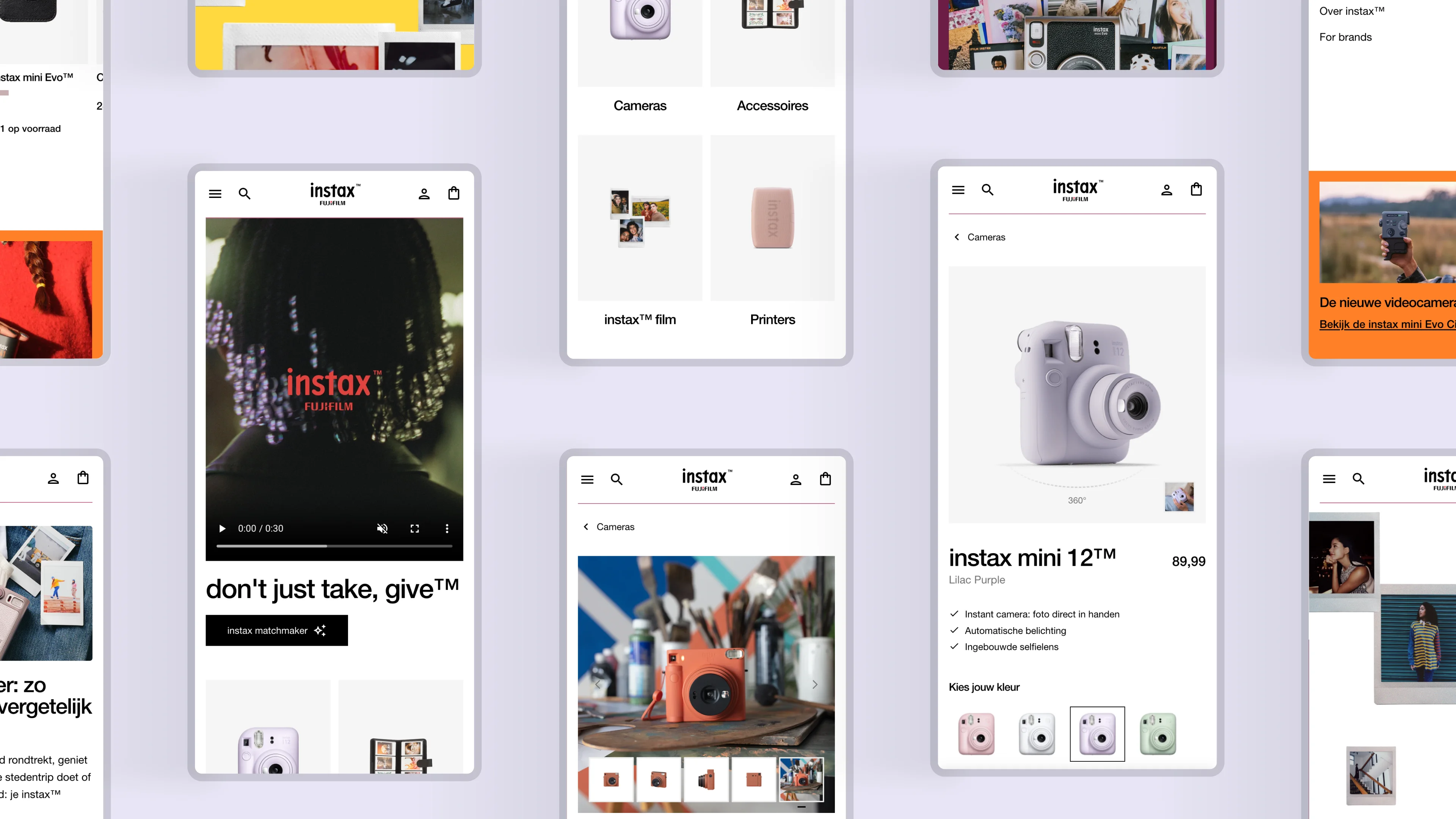 Het nieuwe platform is ontworpen vanuit de essentie van instax™: het gevoel van een geprinte foto in je hand. Dat uitgangspunt vertaalden we naar een visuele identiteit waarin kaders, verhoudingen en kleurvlakken subtiel verwijzen naar het iconische fotoprintformaat. We kozen voor een volwassen en rustig beeld, maar behouden het speelse karakter dat bij de jonge doelgroep past. De interacties zijn licht en doelgericht, animaties ondersteunen de merkbeleving zonder de performance te beïnvloeden. Het resultaat is een consistente digitale omgeving waarin product, content en conversie samenvloeien.