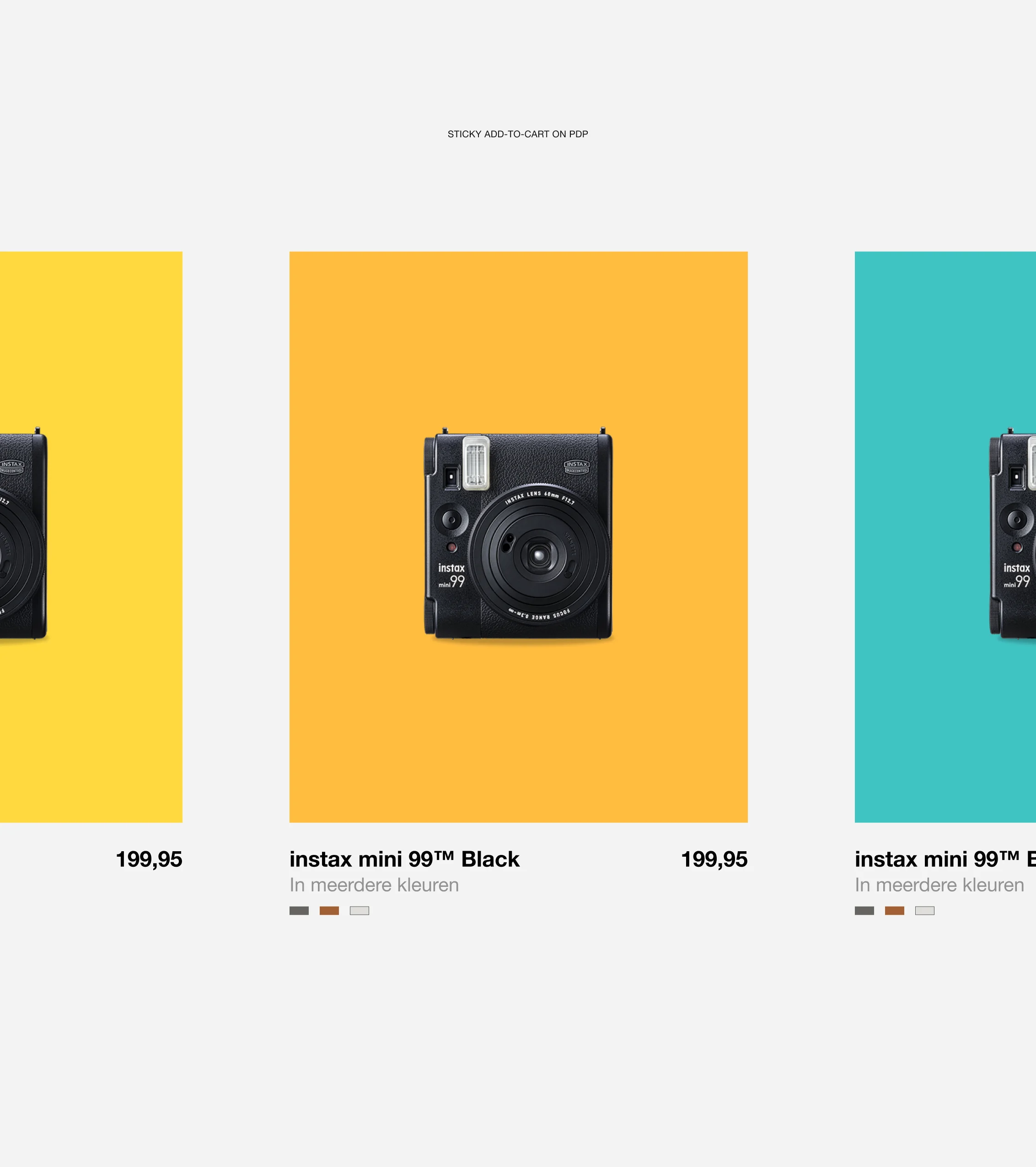 Motion design voegt een laatste laag toe: bij een hover-over een product kleurt de achtergrond in een kleur uit het instax™-palet, willekeurig en zelf instelbaar. Producten zweven naar het winkelmandje als je ze toevoegt. En subtiele zoom-effecten sluiten aan op de essentie van fotografie.