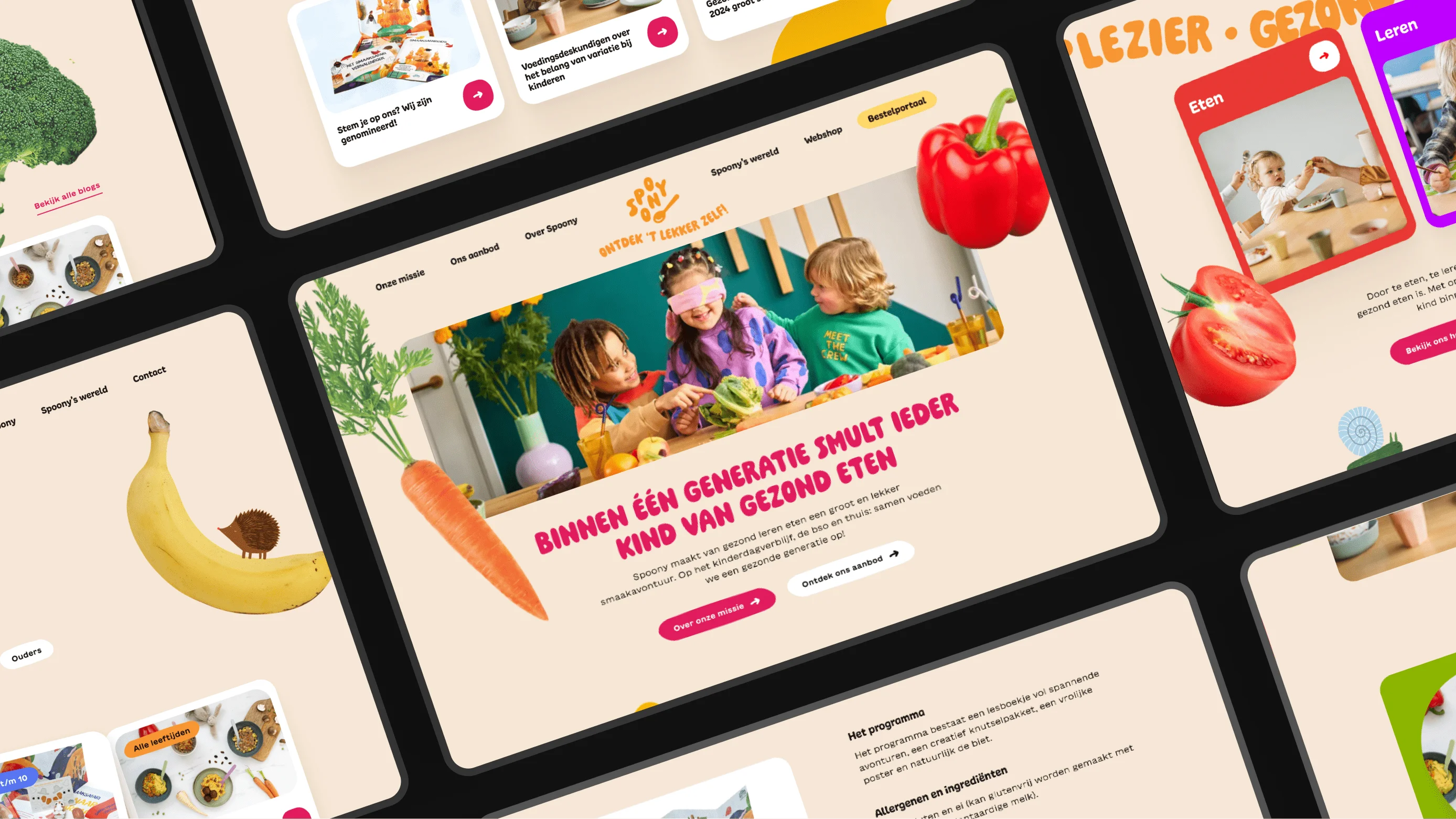 Spoony heeft een serieus doel, maar haar karakter is eigenwijs en blij. Met de vormgeving dompelen we bezoekers onder in een wereld waar groente zweeft, moestuinvriendjes praten en animaties verrassen. Tegen een rustige achtergrond springen knoppen met speelse vormen eruit die de gebruiker de weg wijzen. Zowel op het bestelportaal als op de webshop draait het om gebruiksgemak en een intuïtieve ervaring, waar onze collega’s van Weekend voor zorgen met slimme filters voor maaltijden, kleurplaten of recepten. Waar je ook bent in de klantreis, Spoony zorgt voor kleur en een snufje magie - precies genoeg om de kinderdagverblijven en ouders net zo verliefd te maken op Spoony als kinderen op gezond eten.